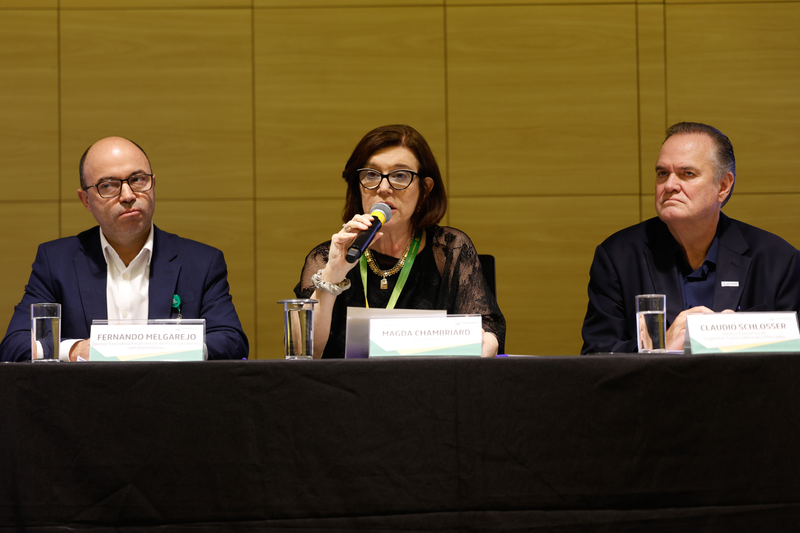 Rio de Janeiro (RJ), 13/03/2026 –A presidente da Petrobras, Magda Chambriard, anuncia o reajuste no preço do diesel ao lado os diretores executivos de Financeiro e de Relacionamento com Investidores, Fernando Melgarejo, e de Logística, Comercialização e Mercados, Claudio Schlosser. Foto: Fernando Frazão/Agência Brasil