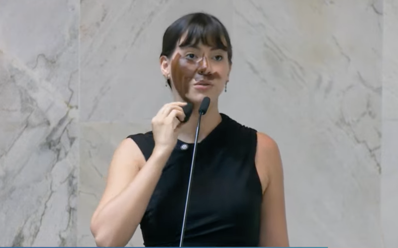 São Paulo/SP - 18/03/2026 - POLITICA - Deputada do PL Fabiana Bolsonaro faz 'blackface' durante discurso contra mulheres trans no plenário da Alesp. Deputada Fabiana Bolsonaro se maquiou durante discurso na Alesp, em encenação de blackface, e afirmou que o ato era uma forma de argumentar que pessoas trans não são mulheres. A deputada Ediane Maria, líder do PSOL na Alesp, fará uma representação em nome da bancada na Comissão de Ética por quebra de decoro e pedido de investigação no Ministério Público por racismo e transfobia. Foto: RS/Fotos Públicas