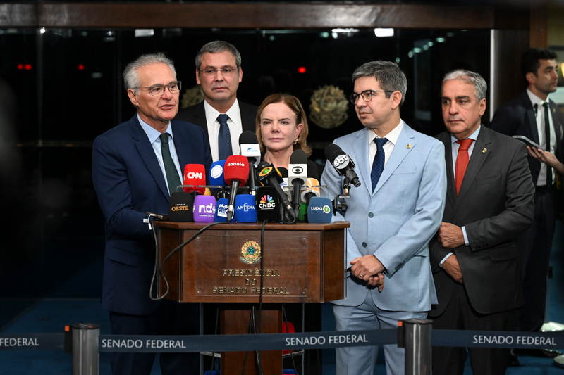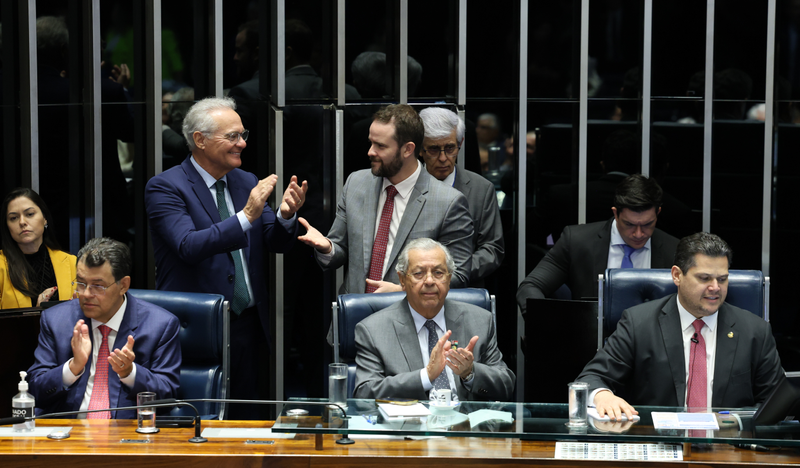 Após a sessão, senador Renan Calheiros (MDB-AL), ministra de Relações Institucionais, Gleisi Hoffmann, e senador Randolfe Rodrigues (PT-AP), líder do governo no Congresso, comemoram e comentam a aprovação da proposta que agora segue para sanção presidencial.